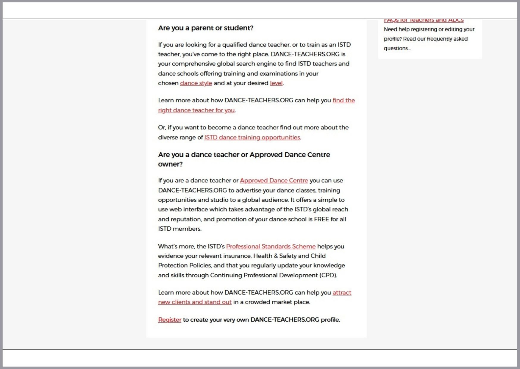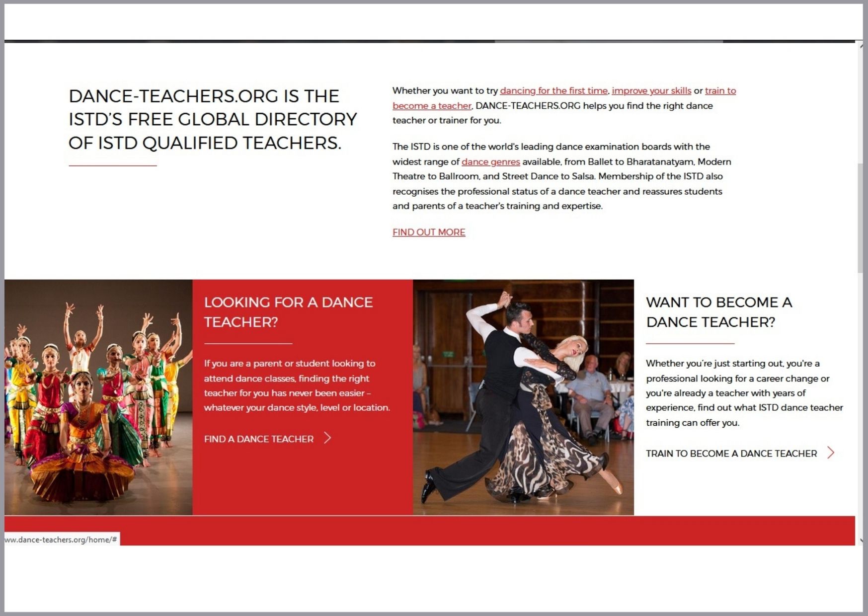 Dance-Teachers.org is a website of the ISTD (Imperial Society of Teachers of Dancing), which aims to provide a directory of their affiliated teachers to people, who are either looking to find a dance teacher or to become one themselves.